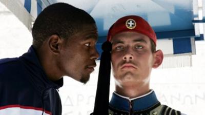 οι οποίοι την επισκέφθηκαν σήμερα. Οι Αμερικανοί άσοι, που συνοδευόντουσαν από τον γενικό γραμματέα της ΕΟΚ, Τάκη Τσαγκρώνη, αποθεώθηκαν από τον κόσμο που βρισκόταν εκείνη την ώρα στο χώρο του Μνημείου του Αγνώστου Στρατιώτη, ενώ μοίρασαν αυτόγραφα και είπαν μερικά από τα ... μυστικά του αθλήματος σε παιδιά της Ακαδημίας Μπάσκετ του Ζέλικο Ομπράντοβιτς, τα οποία τους περίμεναν με μπάλες στα χέρια τους. Παράλληλα, είναι χαρακτηριστικό το γεγονός, ότι οι άσοι της "Ντριμ Τιμ" πήγαν μόνοι τους και φωτογραφήθηκαν με τους τσολιάδες.