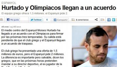 Δεδομένη θεωρεί ο ισπανικός Τύπος τη συμφωνία του Ολυμπιακού με τον Μοϊσές Ουρτάδο, όχι όμως και με την Εσπανιόλ. Η «As» στην ηλεκτρονική της έκδοση αναφέρει ότι οι «ερυθρόλευκοι» εξασφάλισαν...το ‘ναι’ του παίκτη για τρία χρόνια, ενώ η διαφορά που έχουν με την Εσπανιόλ εκτιμάται πως θα καλυφθεί. «Ο Ολυμπιακός προσφέρει 1,5 εκατ. ευρώ και η Εσπανιόλ θέλει 2 εκατ. ευρώ. Η διαφορά είναι μεγάλη, αλλά οι Έλληνες θα στείλουν τον Ντάρκο Κοβάσεβιτς στην Ισπανία για να κλείσει η συμφωνία».